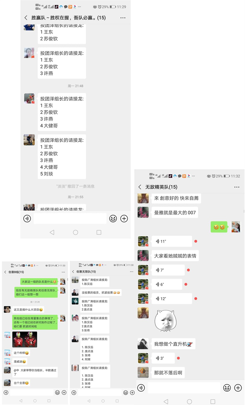 部門主管敲定活動(dòng)細(xì)節(jié)、安排,通過盲選的方式,分配好四組成員,當(dāng)晚建立活動(dòng)微信群,推選各組組長,并展開如火如荼的線上討論,大家集體出謀劃策,尋找素材,分配任務(wù)、尋找制作視頻,迅速敲定主題,并敲定集體制作時(shí)間。