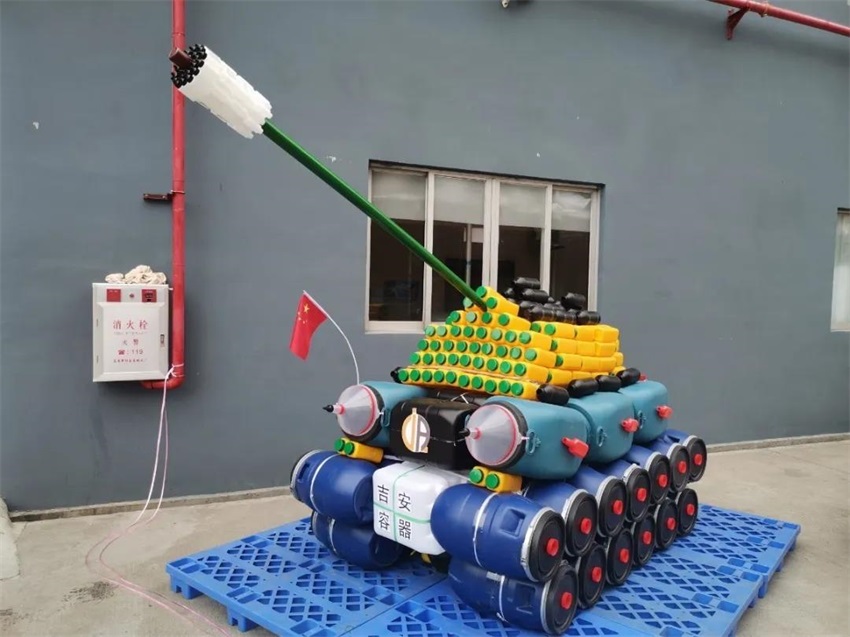 用鐵箍桶組成的坦克,搭配方瓶蓋作為點(diǎn)綴,1L方瓶作為主體,大炮用指甲油瓶拼接而成,方罐、漏斗、圓瓶等采用多系列產(chǎn)品進(jìn)行混搭,居然視覺上毫無違和感,整體效果棒棒噠!