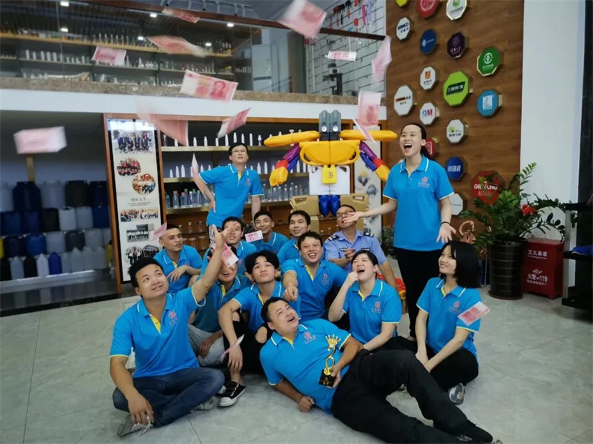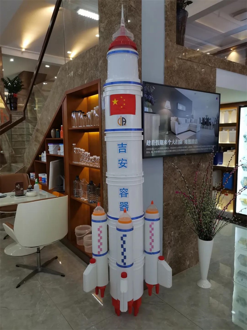 在試用了鐵罐、灰色機(jī)油瓶、膠水瓶等產(chǎn)品均不理想之后,最終敲定采用純色風(fēng)格產(chǎn)品元素搭配藍(lán)色邊框設(shè)計(jì),發(fā)射中的火箭寓意我們團(tuán)隊(duì)業(yè)績一飛沖天,直沖云霄!