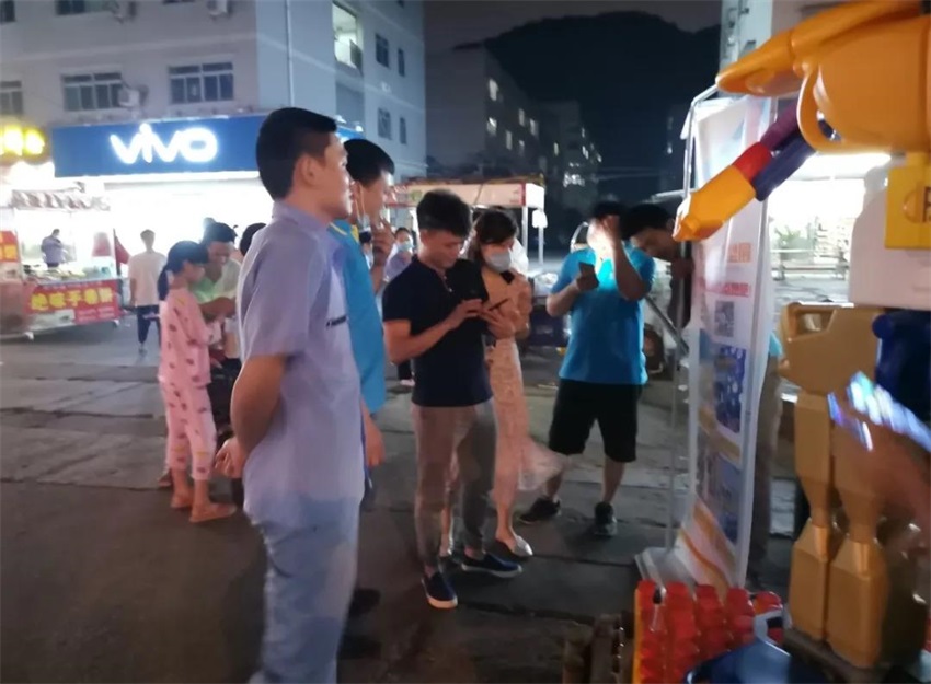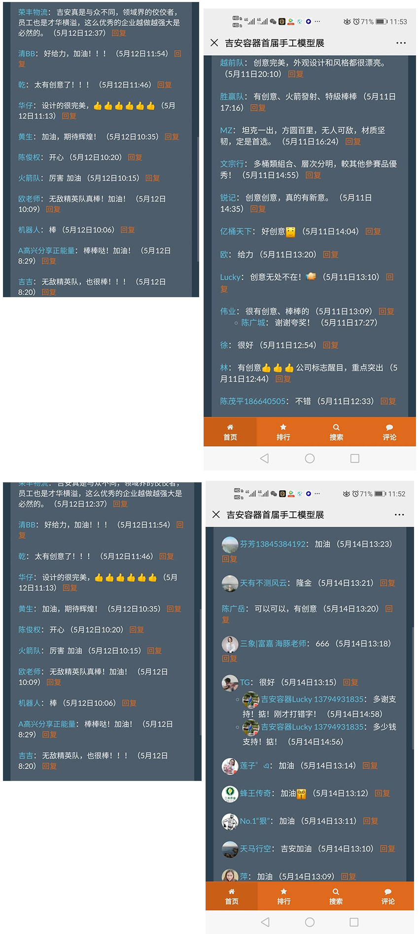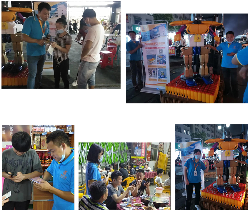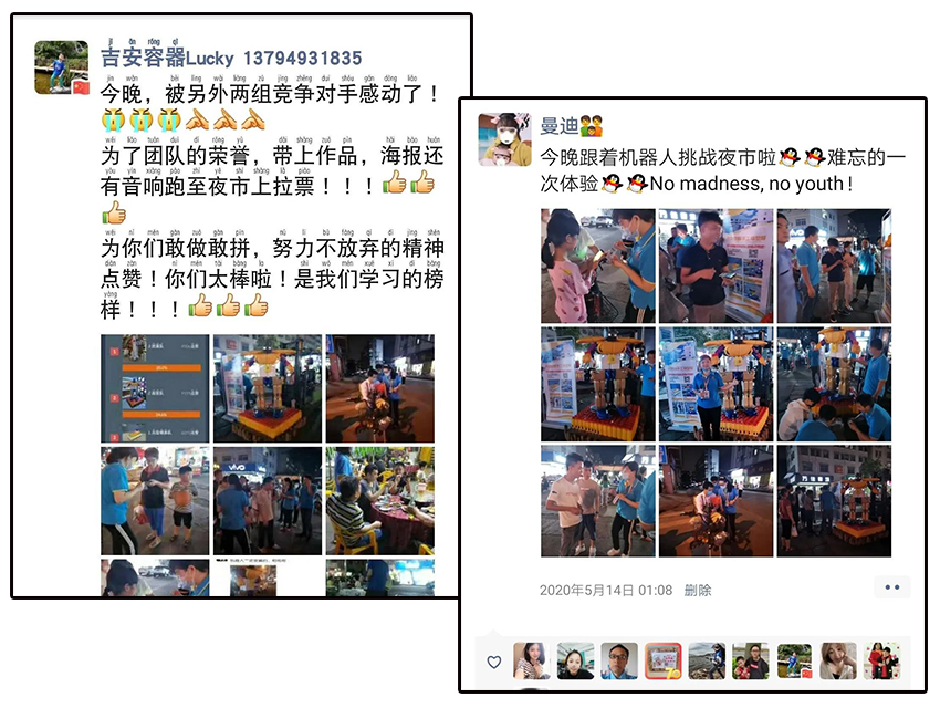 票數(shù)你追我趕,排行榜第一位輪流做,這時(shí)候是提現(xiàn)人脈和拉票技巧的時(shí)候啦!朋友圈也給“吉安大軍”包圍,很快我們也包圍了各自的微信群,各隊(duì)差距變得越來越不明顯,在雙方展開激烈的線上廝殺之時(shí),越前隊(duì)率先出大招,夜市拉票!他們決定把他們的作品機(jī)器人搬出夜市,勇敢的向別人展示他們的作品,進(jìn)行線下拉票。