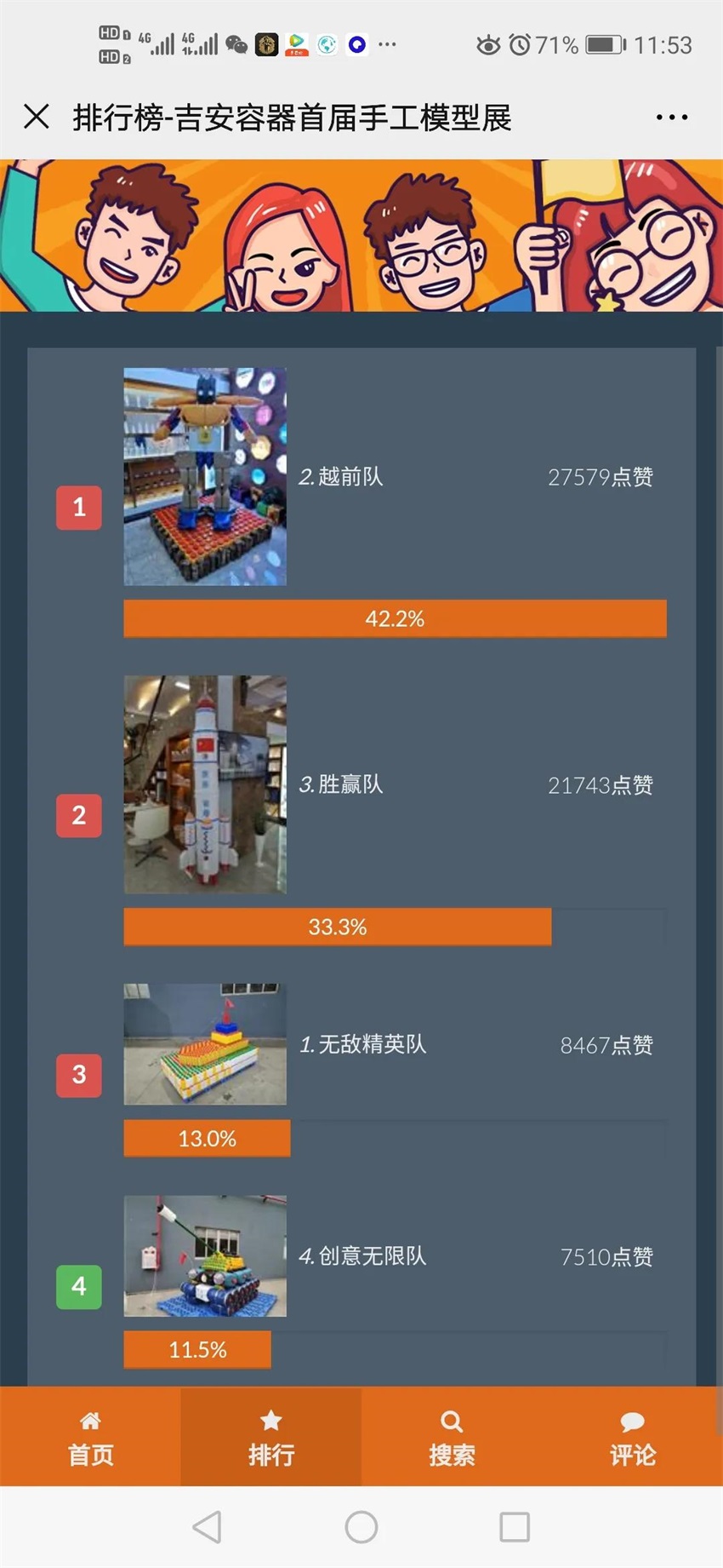 首屆創(chuàng)意手工模型大賽圓滿落下帷幕,感謝每一位支持我們的朋友們,正是因?yàn)橛辛四鷤兊闹С趾凸膭?lì),使得我們整個(gè)團(tuán)隊(duì)更加充滿信心,我們將繼續(xù)發(fā)揮創(chuàng)新、專研、拼搏的精神,本次活動(dòng)帶給我們的刺激、興奮、驚險(xiǎn)、也更深刻的體會(huì)到擔(dān)當(dāng)、分工、合作、協(xié)助、理解的重要性。我們的拉票行為可能會(huì)給大家?guī)砝_,給您們添麻煩了!活動(dòng)的成功離不開每一位客戶朋友們對本次活動(dòng)的包容及大力支持!再次感謝!我們將繼續(xù)發(fā)揚(yáng)“吉安精神”,為客戶提供更高價(jià)值,為團(tuán)隊(duì)奉獻(xiàn)更大力量!