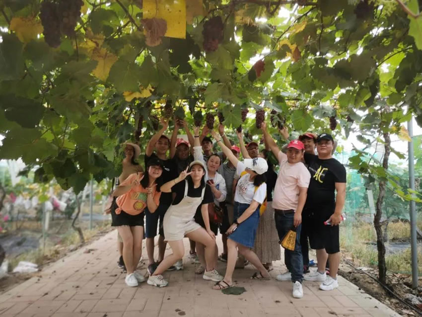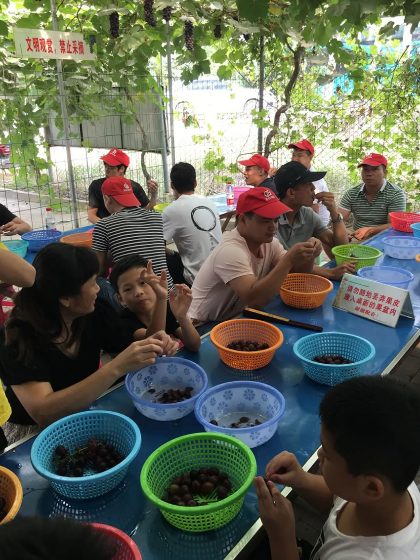 享用完酒店的早餐后,我們一行來到【醇葡鄉(xiāng)村.葡萄】農(nóng)家果園,該果園是目前清遠最大的高科技葡萄種植園。品嘗了果大味甜的新鮮葡萄后,開心的眾人還在果園里進行了舞蹈PK。各組組長帶領組員就公司平日里練習的舞蹈進行比賽。果園老板都被大家的舞姿吸引,詢問“你們是哪里的公司,怎么如此具有活力?”“我們是吉安容器的團隊”大家自豪響亮地回應道,讓人感動!