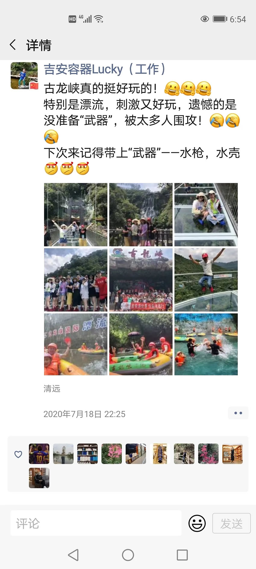清遠之行結束了,這次旅行我們收獲了很多。除了旅行游玩的快樂,我們的團隊更加具有凝聚力。活動中很多人為集體默默奉獻,有些項目不可以帶手機和首飾,就能看到一個人拿著二十幾部手機為挑戰(zhàn)極限的同事加油打氣的場面......