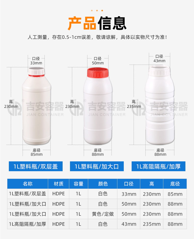 東莞市吉安包裝容器有限公司創(chuàng)立于2000年8月1日,是中國知名品牌企業(yè)。已通過ISO 9001質(zhì)量管理體系資質(zhì)認證,加入了中國中空協(xié)會,并獲得《中國知名品牌》,《國家標(biāo)準(zhǔn)合格產(chǎn)品》,《全國重合同守信用AAA級企業(yè)》,《質(zhì)量.服務(wù).誠信AAA企業(yè)》等榮譽稱號。根據(jù)材質(zhì)的不同,我們的產(chǎn)品分為塑料容器、鐵質(zhì)容器、鋁材容器、玻璃容器、紙質(zhì)容器等五大類。按產(chǎn)品的名稱分為塑料桶、塑料瓶、包裝桶、涂料桶、機油桶、油脂桶、化工罐、膠水瓶、鐵桶、鐵罐、鋁瓶、鋁罐、阻隔瓶、高阻隔瓶等,容量從3ML至1000L多種規(guī)格,多種款式。適合包裝的產(chǎn)品包括:化學(xué)試劑、化工原料、化工助劑、飼料添加劑、油墨、油漆、樹脂農(nóng)藥、日用化學(xué)品、聚氨脂、膠粘劑,廣泛應(yīng)用于化工、建筑、食品、醫(yī)療、生物等各領(lǐng)域。