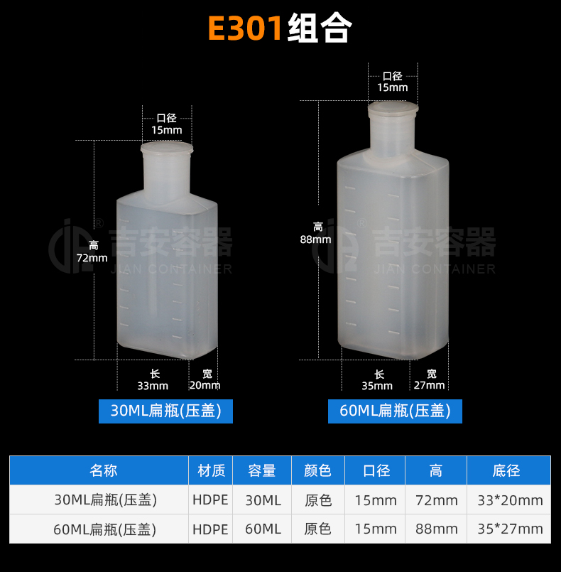 | 品名:30ml/60ml塑料瓶(E301) | |