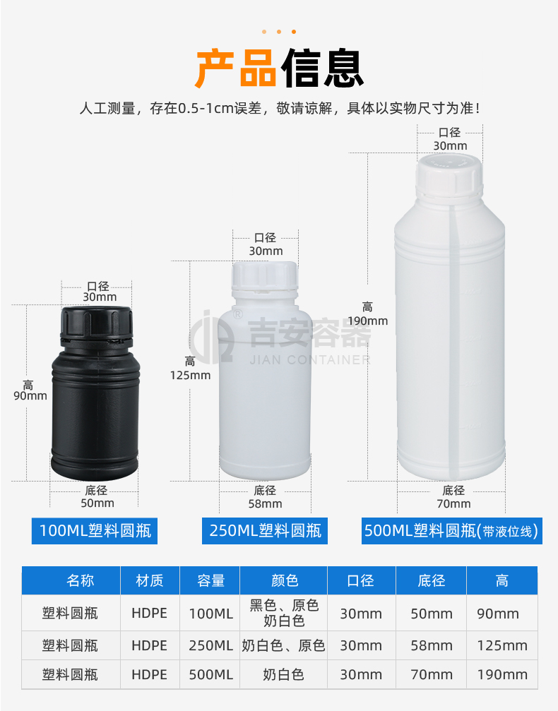 小口塑料瓶采用全新HDPE塑膠原料吹塑而成,具備韌性好、耐酸堿、耐腐蝕、不變形,密封性能佳等特點,可根據(jù)客戶需求定制、改色、產(chǎn)品適用于化工、清洗劑、醫(yī)藥、液體、食品、農(nóng)業(yè)等各行業(yè)包裝。