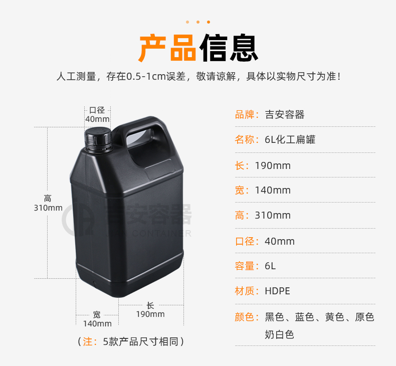 塑料扁罐采用HDPE原材料吹塑而成,具有良好的耐酸堿性及密封性,方形設(shè)計方便堆放,不占用空間,美觀實用。具備不變形,使用方便等特征,可根據(jù)客戶需求做印刷及貼膜,產(chǎn)品適用于尿素、機油、汽油、清洗劑、化工助劑、食品添加劑等液體包裝。