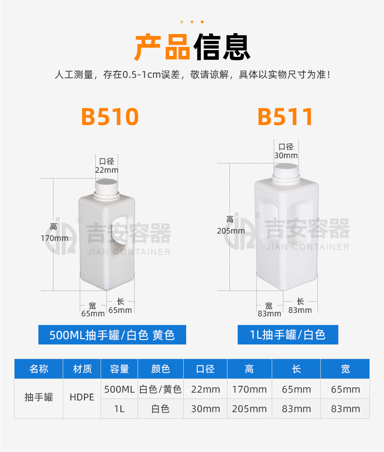 | 容量:500ml | 材質(zhì):罐蓋-PP,罐身-HDPE |
