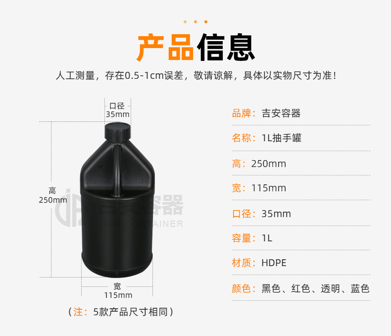 東莞市吉安包裝容器有限公司創(chuàng)立于2000年8月1日,是中國知名品牌企業(yè)。已通過ISO 9001質量管理體系資質認證,加入了中國中空協(xié)會,并獲得《中國知名品牌》,《國家標準合格產(chǎn)品》,《全國重合同守信用AAA級企業(yè)》,《質量.服務.誠信AAA企業(yè)》等榮譽稱號。根據(jù)材質的不同,我們的產(chǎn)品分為塑料容器、鐵質容器、鋁材容器、玻璃容器、紙質容器等五大類。按產(chǎn)品的名稱分為塑料桶、塑料瓶、包裝桶、涂料桶、機油桶、油脂桶、化工罐、膠水瓶、鐵桶、鐵罐、鋁瓶、鋁罐、阻隔瓶、高阻隔瓶等,容量從3ML至1000L多種規(guī)格,多種款式。適合包裝的產(chǎn)品包括:化學試劑、化工原料、化工助劑、飼料添加劑、油墨、油漆、樹脂農(nóng)藥、日用化學品、聚氨脂、膠粘劑,廣泛應用于化工、建筑、食品、醫(yī)療、生物等各領域。